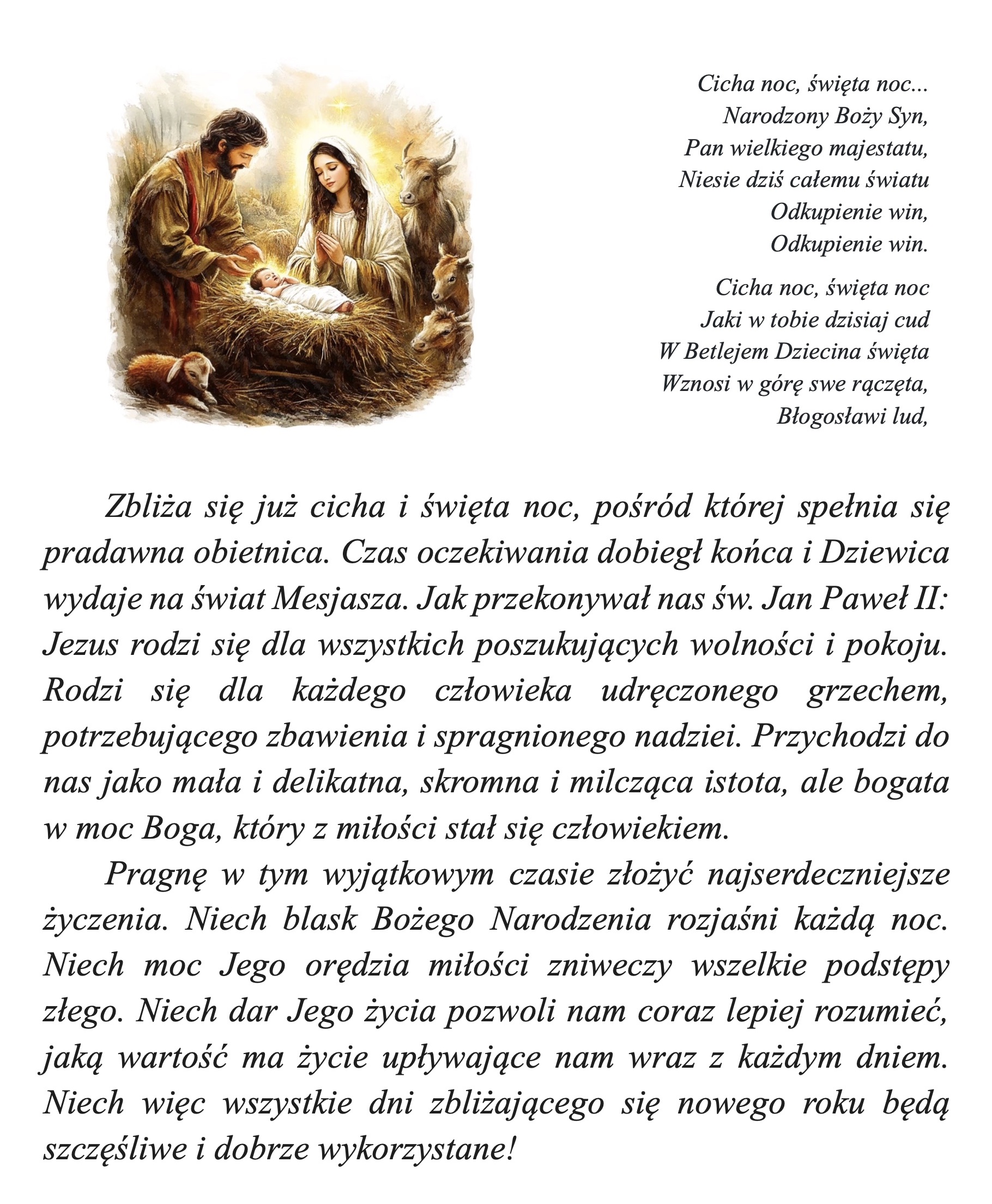 - Serdecznie dziękujemy wszystkim, którzy wczoraj włączyli się w przygotowanie szopki i dekoracji świątecznej naszego kościoła. Dziękujemy także za dostarczenie choinek do naszych kościołów. Wszystkim za okazaną pomoc i życzliwość niech Panu Bóg wynagrodzi swym błogosławieństwem.